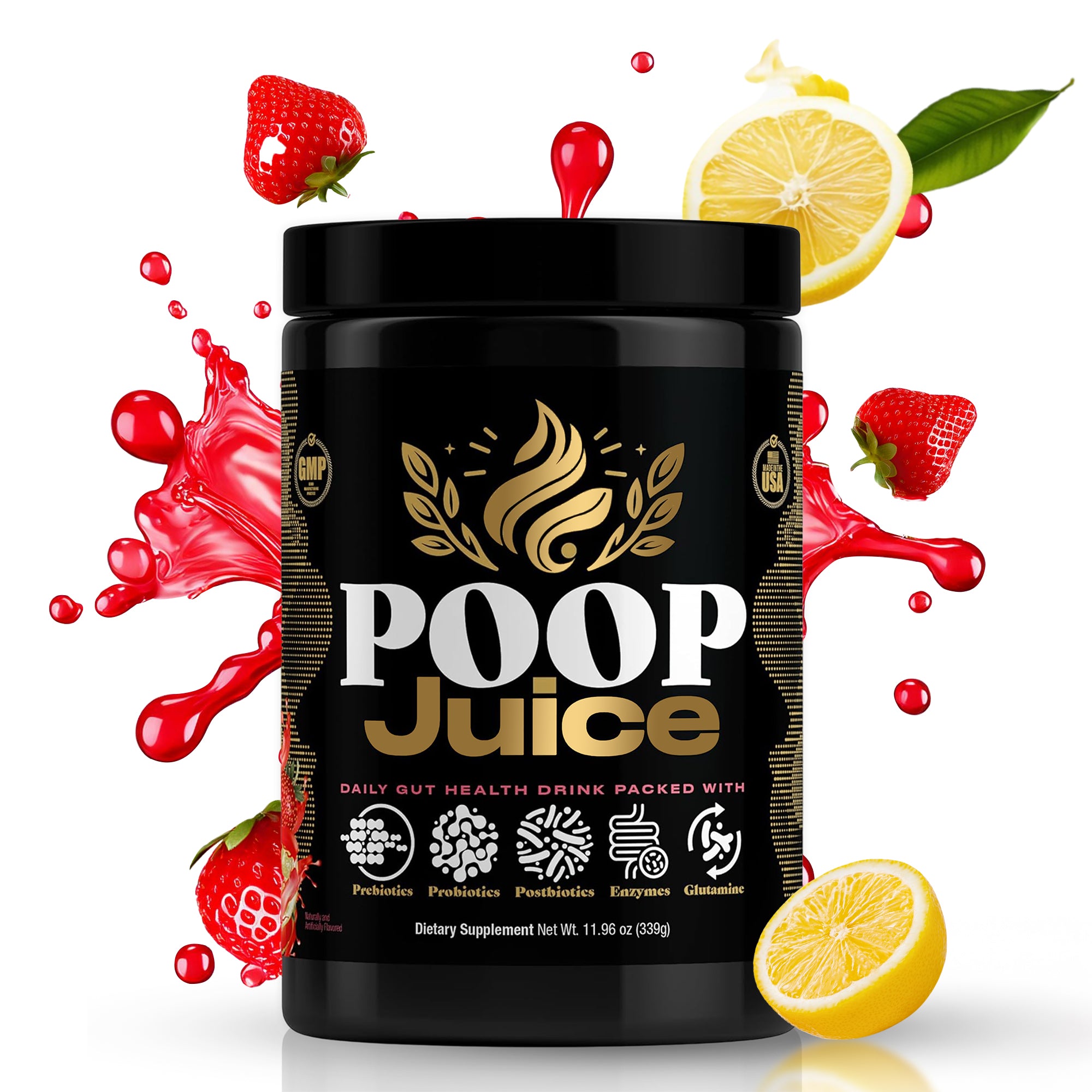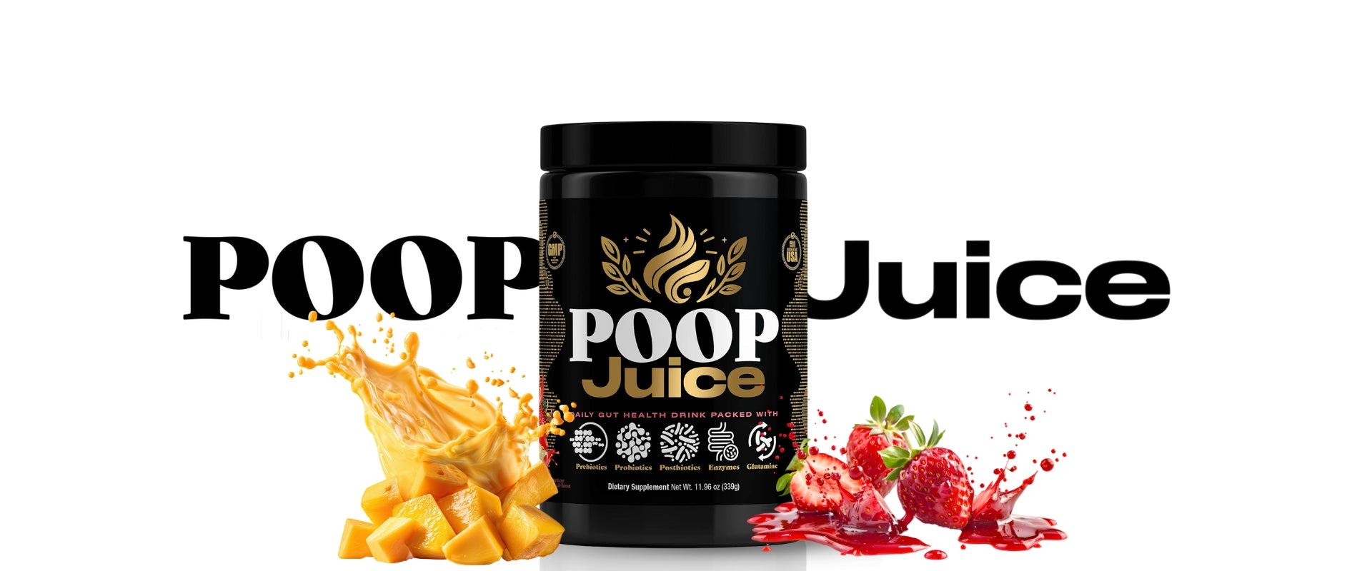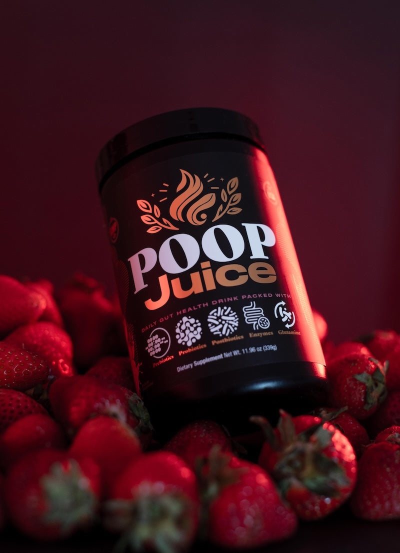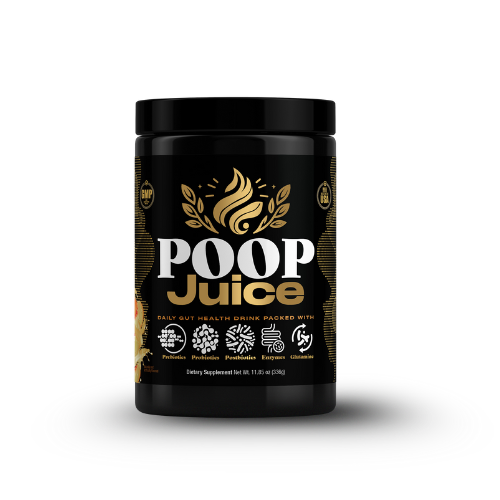 Poop Juice is a daily gut health supplement powered by prebiotics, probiotics, postbiotics, digestive enzymes, and L-glutamine. Zero sugar, gluten-free, lactose-free, dye-free, and 3rd-party lab tested — for smoother digestion, reduced bloating, and better poops every day.